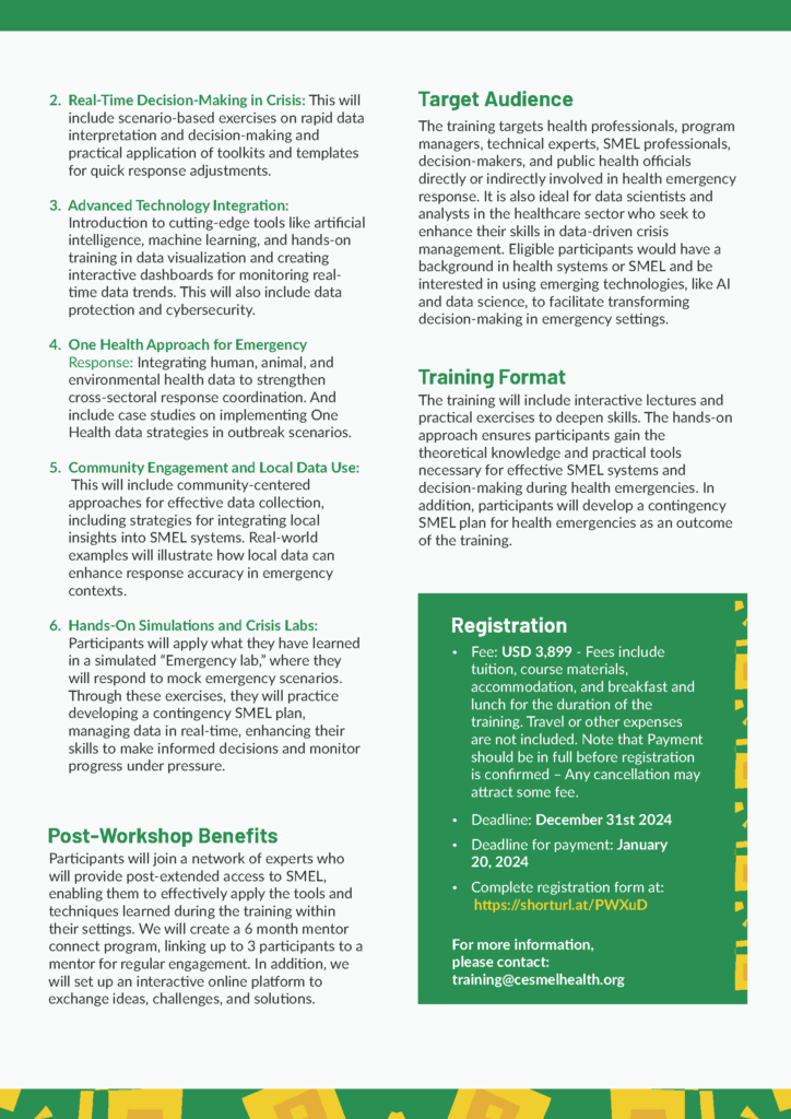 CESMEL Health is offering a two-week intensive training workshop in Nairobi, Kenya, from February 17-28, 2025, focused on Surveillance, Monitoring, Evaluation, and Learning (SMEL) in health emergency contexts. The program targets health professionals and aims to equip participants with skills in data resilience, real-time decision-making, advanced technology integration, and community-centered approaches. Participants will learn to use cutting-edge tools like AI and data science to improve health emergency responses, with hands-on simulations and a six-month mentorship program following the workshop.
