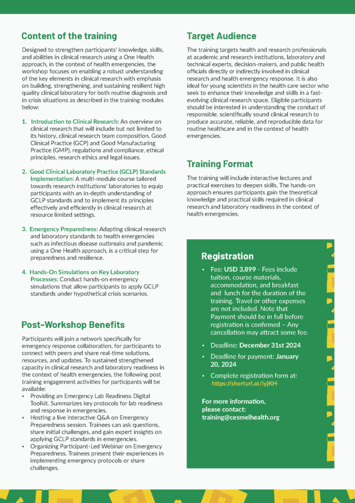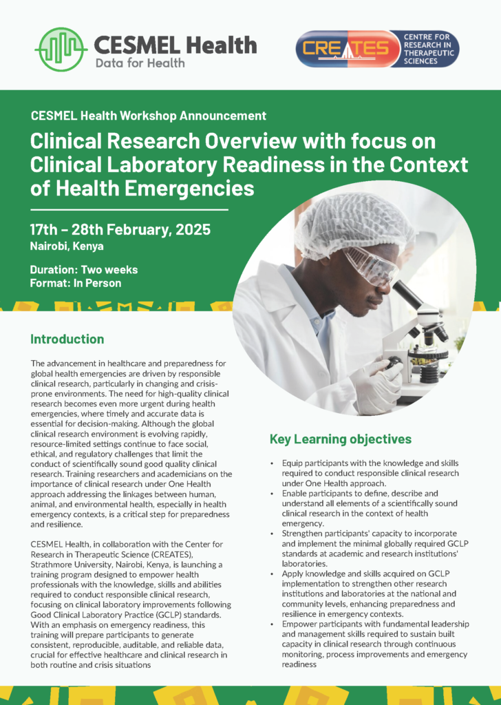 CESMEL Health and Center for Research in Therapeutic Science (CREATES) are offering a two-week training program in Nairobi, Kenya, from February 17-28, 2025, focused on enhancing clinical research and laboratory readiness in health emergencies. The course emphasizes the One Health approach, linking human, animal, and environmental health. Participants will learn Good Clinical Laboratory Practice (GCLP) standards and engage in hands-on simulations to prepare for emergency situations. Targeting health professionals and researchers, the program aims to empower participants with essential skills for conducting responsible clinical research and improving healthcare responses during crises.